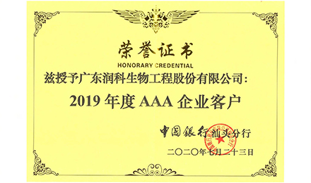 公司荣获中国银行授予2019年度AAA企业客户证书