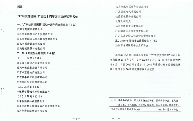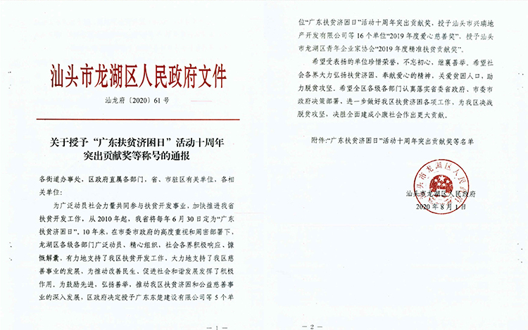 2020年6月获得汕头市龙湖区慈善总会颁发的“热心公益 乐善好施”荣誉证书,2020年8月获得汕头市龙湖区人民政府授予的“2019年度爱心慈善奖”。