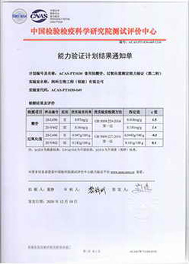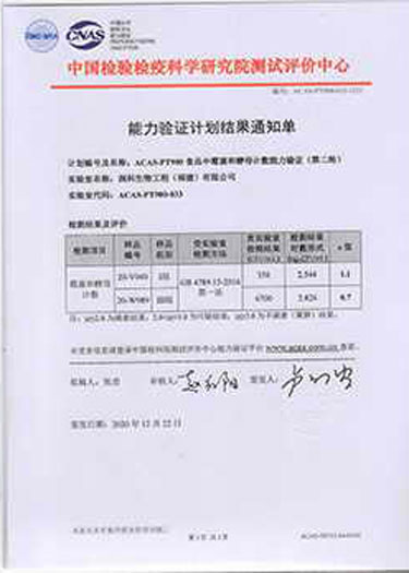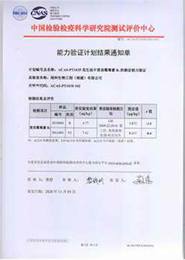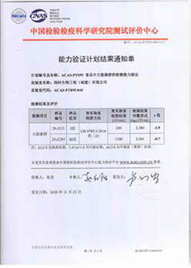 润科生物中心实验室检测水平不断提升,积极参加中国检验检疫科学研究院测试评价中心开展的能力验证计划,累计已参与了菌落总数、黄曲霉毒素B1、铅、大肠菌群、酸价、过氧化值、霉菌和酵母计数等多项指标检测能力验证,验证评价结果均为满意。