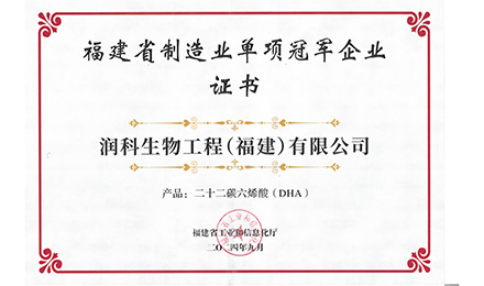 2024年9月,润科生物工程(福建)有限公司凭借二十二碳六烯酸(DHA)产品,荣获了“福建省制造业单项冠军企业”证书。