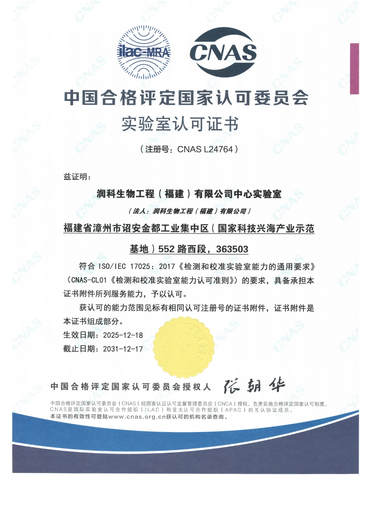 近期,润科生物中心实验室成功通过中国合格评定国家认可委员会(CNAS)评审,正式获得CNAS实验室认可证书。