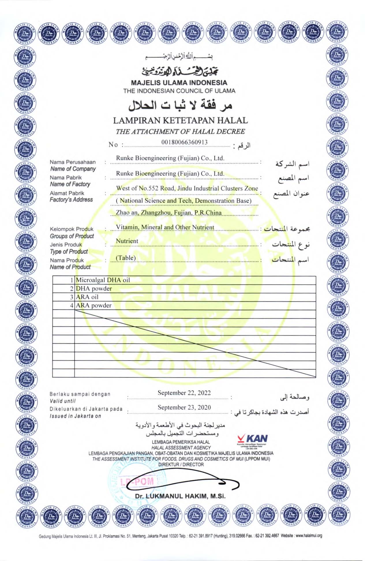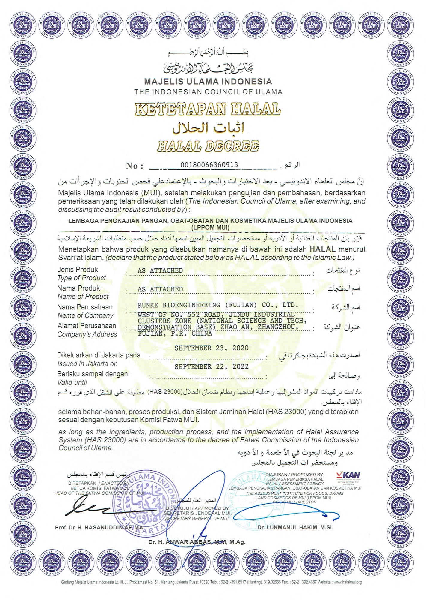 In September 2020, Runke Bioengineering (Fujian) Co., Ltd. successfully obtained the Halal certification (re-evaluation) from the Indonesian Food, Drug, and Cosmetic Evaluation Institute (LPPOM MUI).